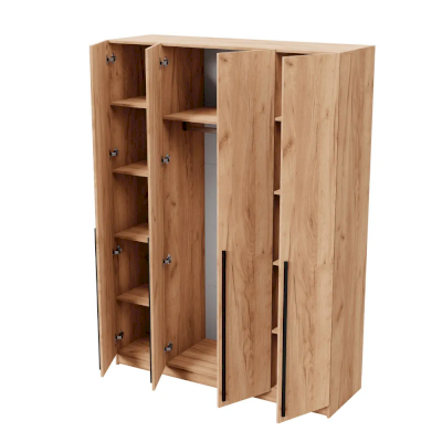 Четырехстворчатый шкаф имеет универсальный вариант для хранения: на боковых полках можно разместить нижнее белье, одежду, постельное белье, а на горизонтальной штанге развесить одежду на вешалках. Сочетание платяного и бельевого отсеков позволяет использовать шкаф в качестве комбинированного.