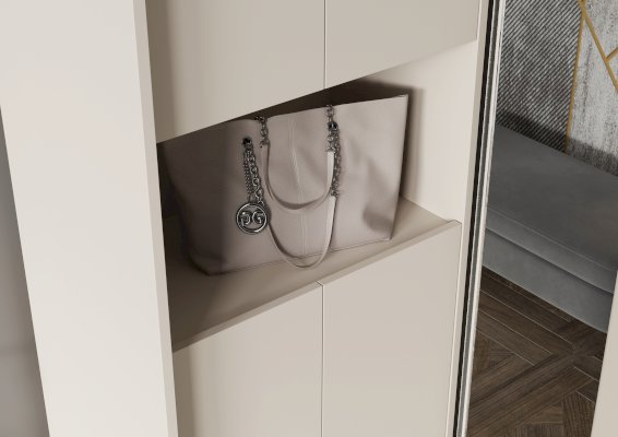 Разделение на секции: Одна часть прихожей включает две одинаковые секции с полками, закрытые створками. В каждой секции предусмотрено по две съёмные полки, что позволяет настраивать пространство под ваши нужды. Открывание створок осуществляется за выступ, что делает использование шкафа более удобным.